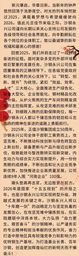 沙钢永兴新年寄语:砥砺奋进 共赴新程!