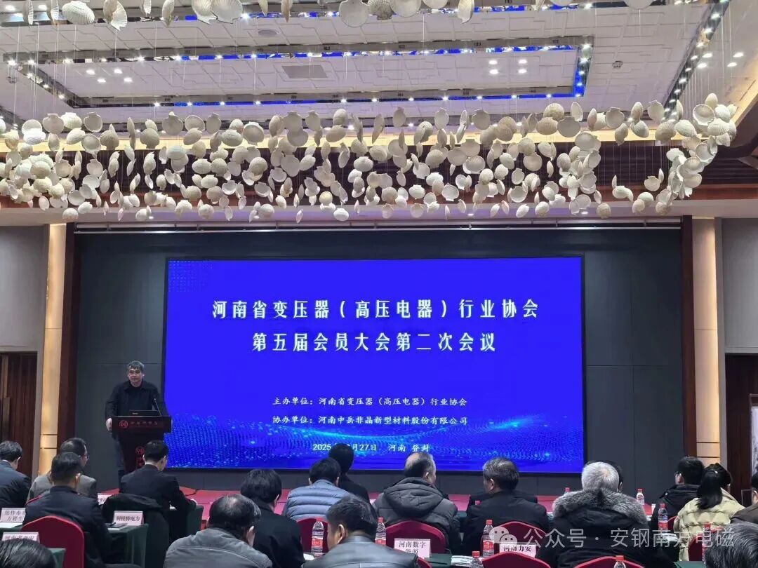 2025年12月27日,河南省变压器(高变压器)行业协会第五届会员大会第二次会议隆重召开,安钢南方电磁公司作为重要会员单位受邀参会。公司党总支书记、董事长戚新军作为受邀单位里第一个发言的单位,对河南钢铁集团取向硅钢发展情况进行了专题介绍。