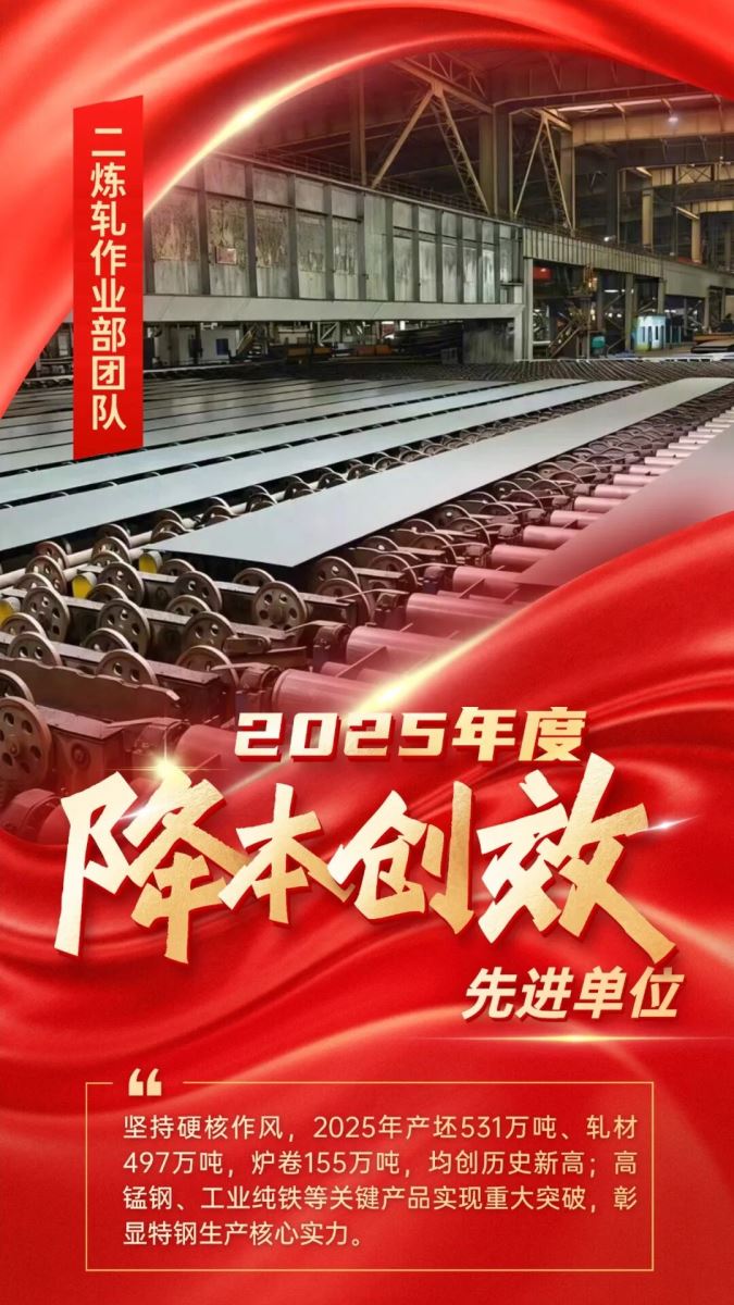 表彰先进,更励前行!希望受到表彰的集体珍惜荣誉、再创佳绩,各单位要以先进为标杆,拿出“闯”的勇气、“拼”的劲头、“干”的实效,凝心聚力、克难攻坚,为股份公司圆满完成2026年奋斗目标、推动特钢转型发展做出新的更大贡献!