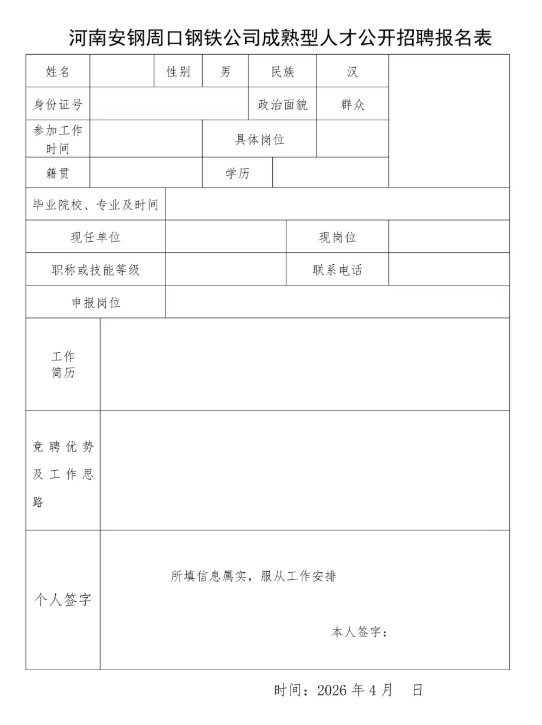 关于河南安钢周口钢铁有限责任公司面向社会公开招聘成熟型人才的公告