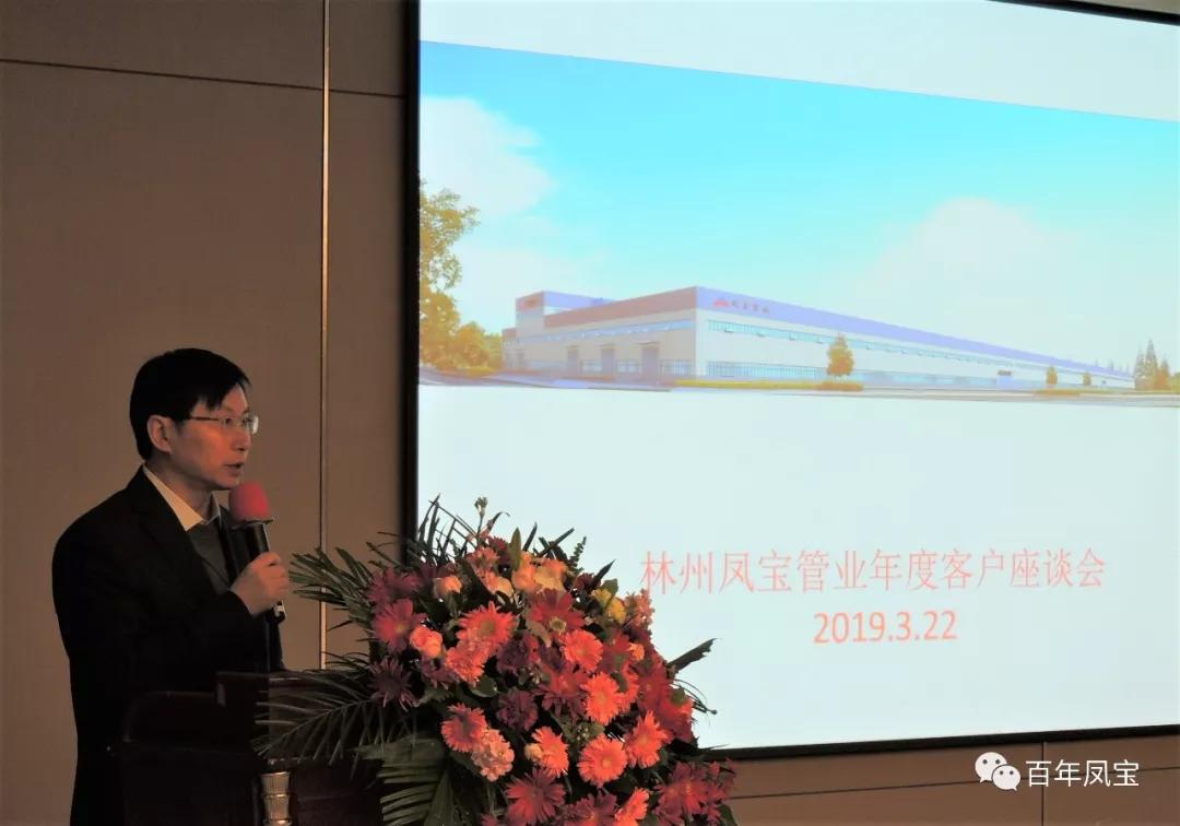 凤宝管业总经理肖永忠致欢迎词,对一年来广大客户和社会各界对凤宝管业建设发展的关心和支持表示衷心感谢。他说,2018年,凤宝管业完成销售收入45亿元,实现利税3.2亿元,整体产销平衡。在新的一年里,凤宝管业以全面贯彻落实高质量发展全面提升为指引,全力推进各项重点工作,进一步创造、壮大企业竞争优势,确保企业在新形势下继续保持高效稳健发展。