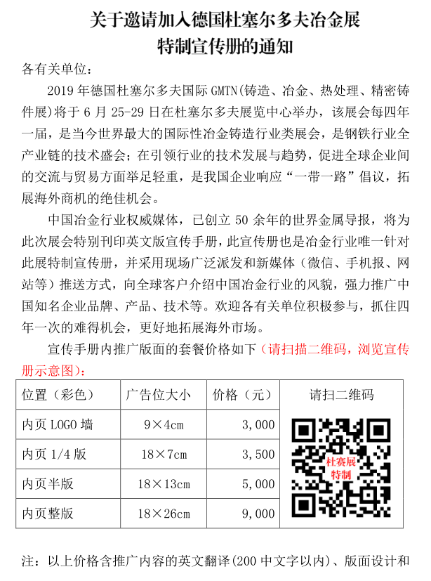 关于邀请加入德国杜塞尔多夫冶金展特制宣传册的通知