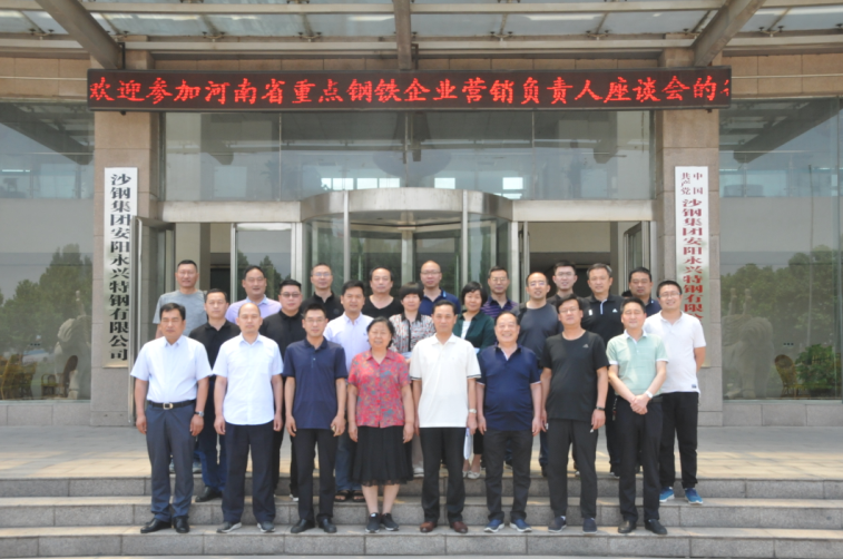 河南省重点钢铁企业营销负责人座谈会于2019年6月14日在沙钢永兴特钢召开。参加会议有安钢股份公司、安钢集团信阳钢铁、济源钢铁、舞阳钢铁、沙钢永兴特钢、南阳汉冶特钢、金汇不锈钢、凤宝特钢等14家重点钢铁企业销售部门负责人、专家共27人。