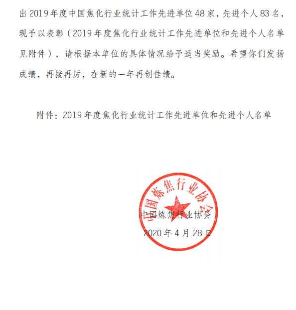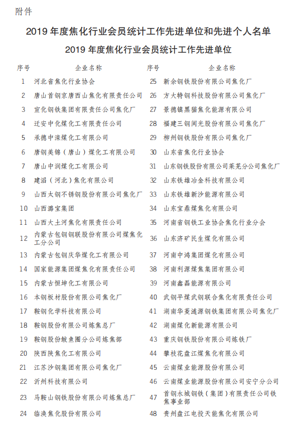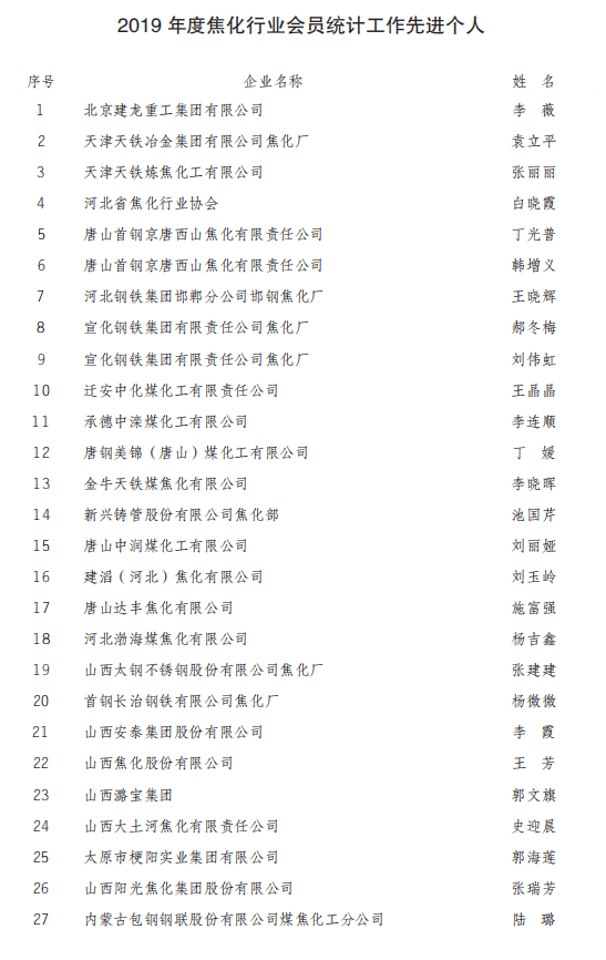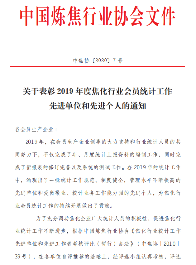 关于表彰 2019 年度焦化行业会员统计工作先进单位和先进个人的通知