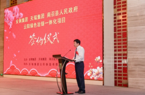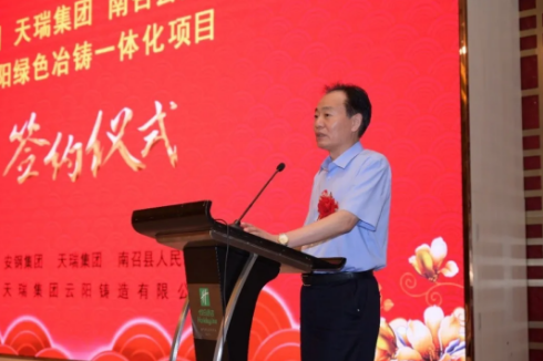 刘永国在致辞中说,天瑞集团是南召县重要的战略合作伙伴,长期以来投资南召、支持南召,为南召经济社会发展作出了巨大贡献。安钢集团作为河南省最大的精品板材和优质建材生产基地,在钢铁冶炼、球墨铸铁管及机械加工等领域实力雄厚、技术先进。这次三方合作建设云阳绿色冶铸一体化项目,打造绿色化、智能化、高端化铸造产业园,为南召振兴发展打下了坚实基础。南召县委、县政府将恪守承诺、诚信为本、服务至上,全力协调解决项目建设中遇到的困难和问题,用一流的营商环境,把三方的友好合作推向深入。