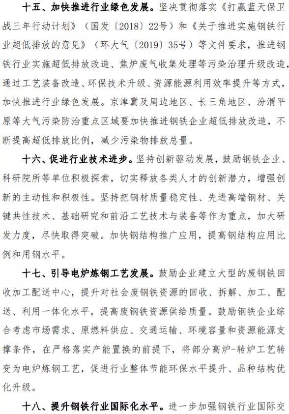 该《通知》表示,国家有关部门将继续开展巩固钢铁煤炭去产能成果专项督查抽查,坚决防止已经退出的项目死灰复燃。《通知》明确,要继续深化钢铁行业供给侧结构性改革。进一步完善钢铁产能置换办法,加强钢铁产能项目备案指导,促进钢铁项目落地的科学性和合理性。进一步加强事中事后监管,严格落实安全、环保、能耗、质量、用地、产业政策和产能置换等相关要求,严禁以任何名义、任何方式新增钢铁冶炼产能,严肃查处各类钢铁产能违法违规行为,加快推动落后产能退出,严防“地条钢”死灰复燃和已化解过剩产能复产。指导企业复工复产,做好行业运行监测分析,维护行业平稳运行。进一步推动钢铁行业绿色化发展,加快京津冀及周边地区、长三角地区、汾渭平原等大气污染防治重点区域钢铁企业超低排放改造,发展电炉钢工艺。进一步推动钢铁企业实施兼并重组,增强企业创新意识,为钢铁行业实现由大到强转变奠定坚实基础。