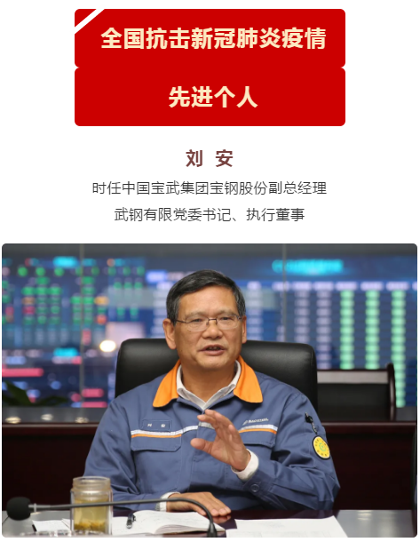 在钢铁行业中,时任中国宝武钢铁集团有限公司宝山钢铁股份有限公司党委常委、副总经理刘安,湖南华菱湘潭钢铁有限公司部门主管袁君奇,河南省安钢集团公司职工总医院副院长、工会主席、主任医师魏兆勇荣膺“全国抗击新冠肺炎疫情先进个人”;中国宝武集团宝钢股份武钢有限气体公司荣膺“全国抗击新冠肺炎疫情先进集体”。
