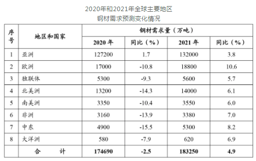 2020年和2021年全球主要地区钢材需求预测变化情况见下表。