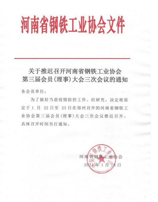 关于推迟召开河南省钢铁工业协会第三届会员(理事)大会三次会议的通知