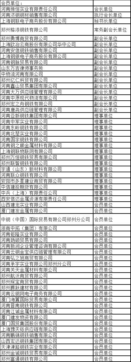 河南省钢铁工业协会钢贸分会会员单位分别是:河南晋南钢铁有限公司、河南晋南钢铁有限公司、郑州航沃商贸有限公司、河南弘之旭商贸有限公司、河南承宇实业有限公司郑州分公司、郑州琛宝商贸有限公司、郑州腾跃建材有限公司、上海豫天铄供应链有限公司,河南鹏锦钢铁销售有限公司、河南江诚金属材料有限公司、厦门建发物资有限公司、厦门国贸集团股份有限公司、厦门海翼国际贸易有限公司、山西宏达钢铁集团有限公司、天津津路钢铁实业有限公司、郑州金诚钢铁贸易有限公司、郑州富通钢铁有限公司。