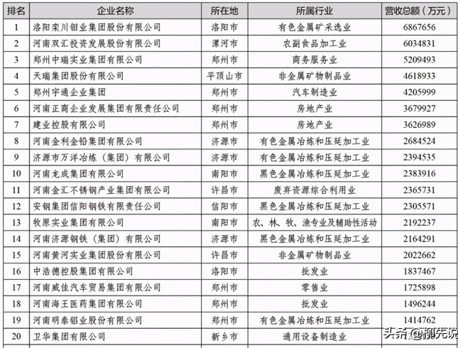 河南文化灿烂,人杰地灵、资源丰富,是全国农产品主产区和重要的矿产资源大省。不仅劳动力资源丰富,消费市场巨大,还是全国重要的综合交通枢纽和人流、物流、信息流中心。下面来盘点最新一期“河南民营企业100强榜单”前20名的基本情况。