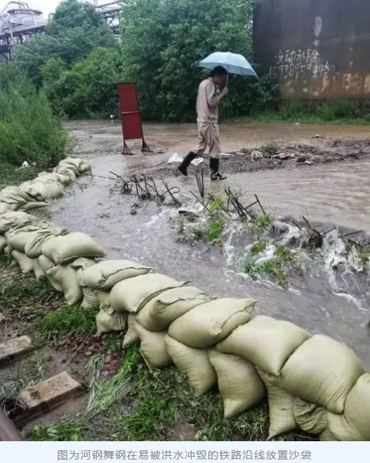 入汛以来,河钢集团舞钢公司提前准备,确保物资充足和各项应对措施到位,对防汛重点地段、重点工程和重点部位逐一排查、加强监控,对用电设备、用电线路、避雷设施等进行全面细致检查,防止厂区、车间、库区被淹,防止雨天触电、雷击等事故发生,同时组织防汛抢险队伍的建立和演练,确保安全度汛。