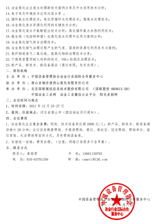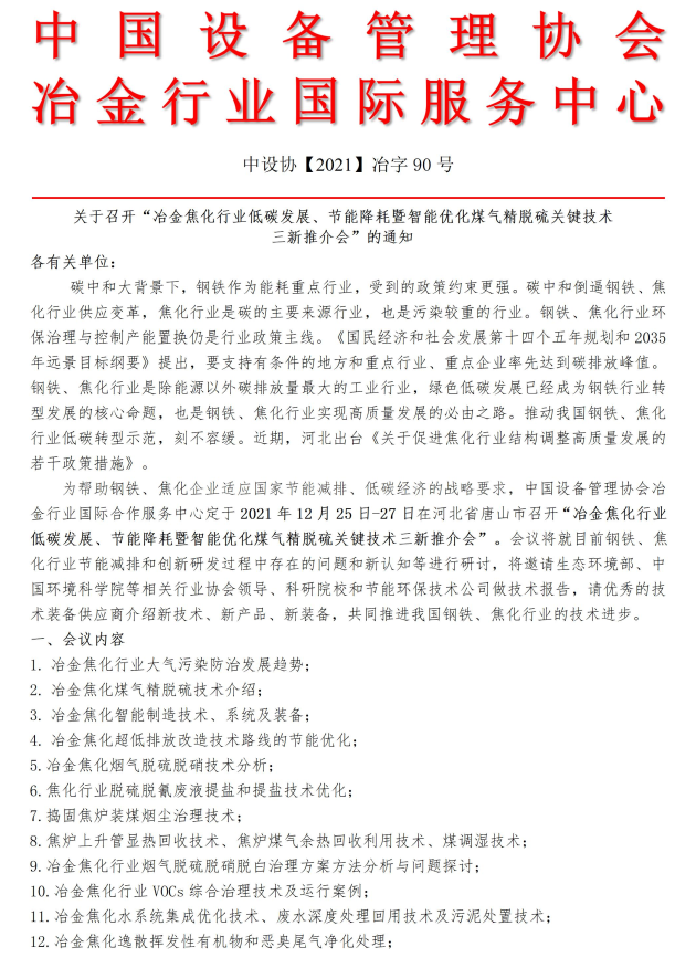 关于召开“冶金焦化行业低碳发展、节能降耗暨智能优化煤气精脱硫关键技术三新推介会”的通知