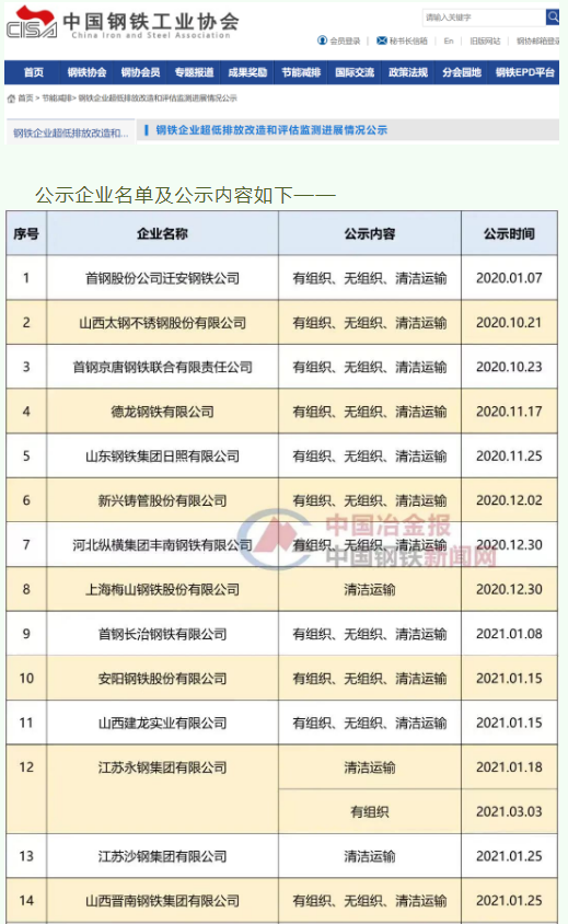 自2020年8月起,中国钢铁工业协会开展了钢铁企业超低排放改造和评估监测进展情况公示工作,截至目前,已有46家企业在钢协网站进行公示。
