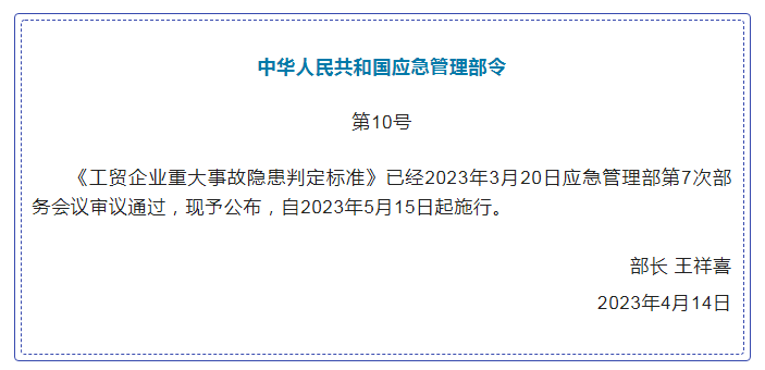 第一条 为了准确判定、及时消除工贸企业重大事故隐患(以下简称重大事故隐患),根据《中华人民共和国安全生产法》等法律、行政法规,制定本标准。