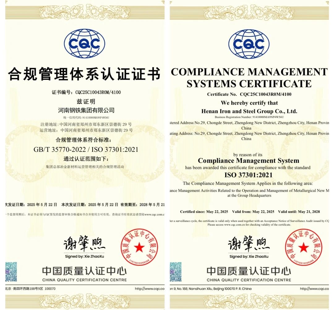 喜讯!河南钢铁集团获合规管理体系国际国内双贯标认证