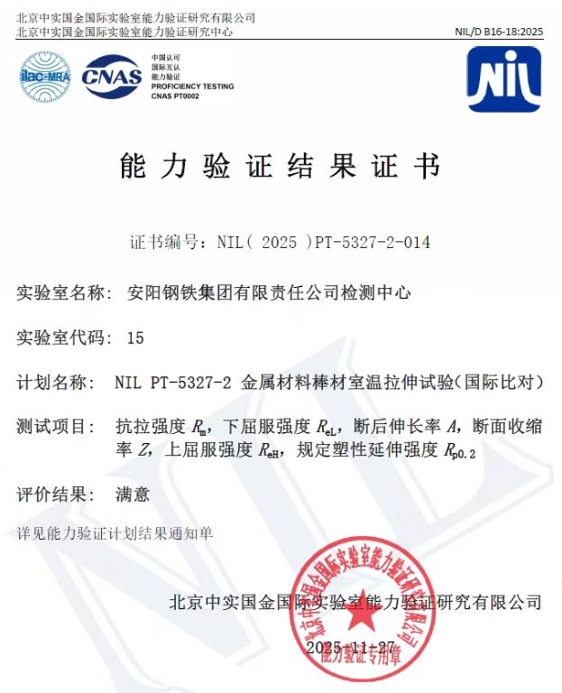 12月1日,随着年度最后一项能力验证“棒材室温拉伸试验”获得“满意”评价证书,质量管控中心2025年度理化检测能力验证工作圆满结束。本年度参与的9项验证项目均获第三方权威机构“满意”评价,充分体现了该中心在物化检测领域的扎实能力和可靠水平。(郝杰)